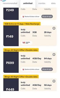 VI Newly Unlimited Data Offer Called Binge All Night Offer And This Offer Is Live In VI App With All Available Recharge Options